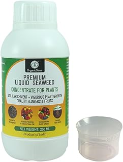 OrganicDews Liquid Seaweed Concentrate for Plants 250 ml with Measuring Cup 25 ml Fertilizer for All Indoor and Outdoor Plants 250 ml